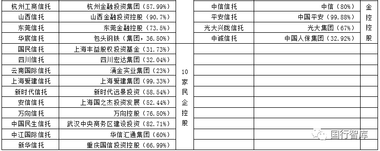 5、10家民企背景的信托公司分別為國民信托、四川信托、云南國際信托、愛建信托、新時代信托、安信信托、萬向信托、民生信托、中江國際信托、新華信托。
