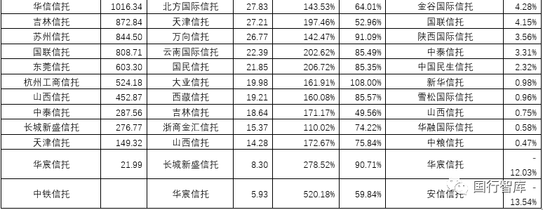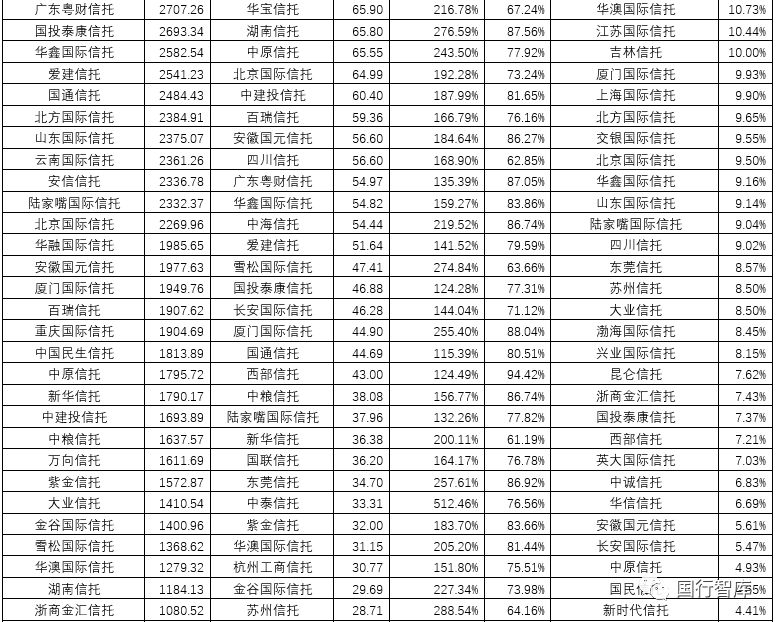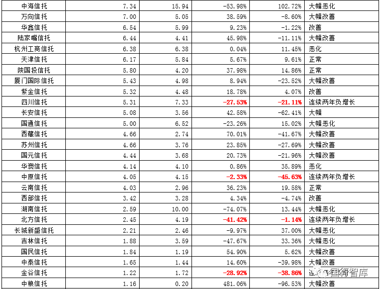 4、當然也有一些信托公司的業績出現了明顯改善,如中糧信托(同比481.06%)、國聯信托(360.93%)、新華信托(241.30%)、西藏信托(70.01%)、英大信托(66.66%)、國投泰康信托(63.77%)、國民信托(54.90%)、陸家嘴信托(45.98%)、長安信托(42.58%)、萬向信托(38.59%)等等。