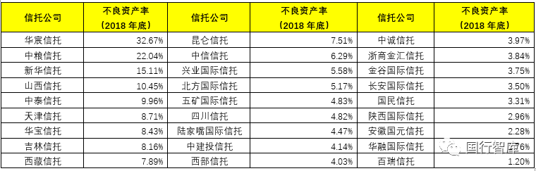 3、資產質量(2018年底):4家不良資產率超過10%、不良資產率在5-10%區間的信托公司有9家