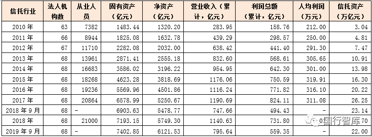 (1)2013年以來,我國信托法人機構數量便一直穩定在68家,從業人數超過2.10萬人,人均利潤達到300萬元左右。