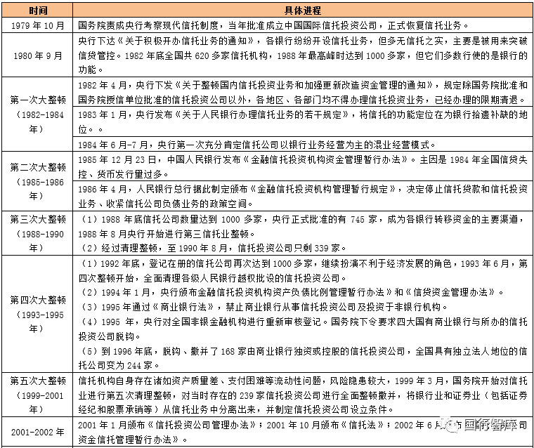 1、1979年與2001年是兩個關鍵的時間點,1979年信托業務恢復、2001年我國信托法正式發布。不過在1982-2001年的近二十年時間里,我國信托公司的亂象非常突出,歷經五次大整頓(分別為1982-1984年、1985-1986年、1988-1990年、1993-1995年、1999-2001年)。