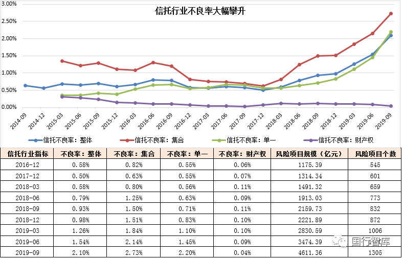 具體來看,截至2019年9月底,集合類信托、單一類信托和財產權信托的不良率分別為2.73%、2.20%和0.04%,特別是集合類信托和單一類信托的不良率分別較2019年6月底上升0.59個百分點和0.75個百分點,項目質量惡化趨勢非常明顯。