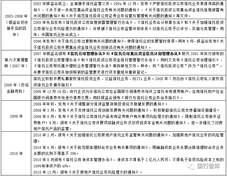 應該說,直至央行分別于2001年1月、2001年10月和2002年6月頒布《信托投資公司管理辦法》、《信托法》和《信托投資公司資金信托管理暫行辦法》以及2003年銀監會正式成立,信托行業的五次大整頓才算告一段落,信托行業也正式從央行管轄期過渡至銀監會管轄。
