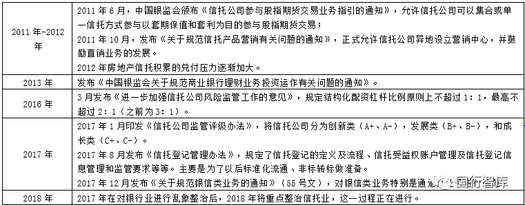2007年銀監會發布《信托公司管理辦法》和《信托公司集合資金信托計劃管理辦法》正式取代2001年央行頒布的《信托投資公司管理辦法》和《信托投資公司資金信托管理暫行辦法》。同時又發布《信托公司治理指引》、《信托公司受托境外理財業務管理暫行辦法》等政策性文件。這一時期銀監會將“信托投資公司”改為“信托公司”新兩規,使信托公司的業務發展逐步邁入相對正軌的階段。
