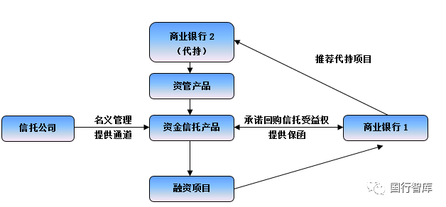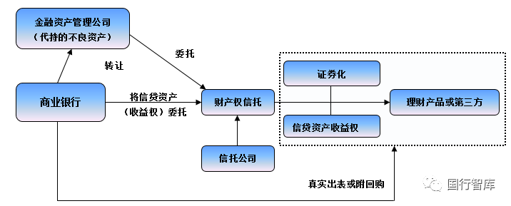 一是商業銀行將不良資產轉讓給AMC代持,而AMC將代持的不良資產委托給信托公司成立財產權信托,形成信托收益權,并由商業銀行負責不良資產的處置清收工作(商業銀行承諾回購信托收益權)。