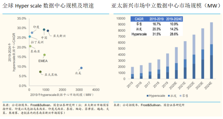 根據(jù) Frost&Sullivan 數(shù)據(jù),從全球范圍看,亞太新興市場(chǎng)的超大型數(shù)據(jù)中心市場(chǎng)規(guī)模僅次于北美地區(qū):2019 年總負(fù)載達(dá)到 1120MW,且成長性突出,是全球增速最快的地區(qū)。