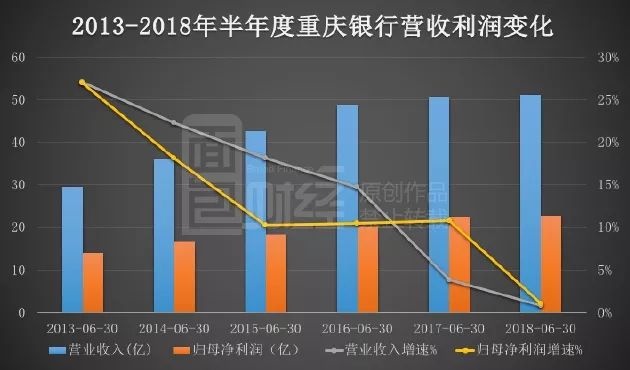 營收凈利潤實現(xiàn)翻倍增長的同時,增長速度卻在大幅下降。上市首年重慶銀行營收和凈利潤的增長速度速均為27%,次年增速便開始下滑。截止2018年6月30日,重慶銀行的營收增速僅有0.85%,歸母凈利潤的增速為1.02%,營收凈利在2018年上半年趨近于零增長。