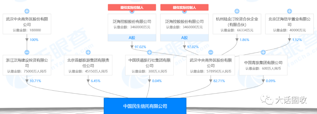 2016年,民生信托59.65%股權(quán)全部轉(zhuǎn)讓給武漢中央商務(wù)區(qū)建設(shè)投資股份有限公司,實(shí)控人仍然為泛海控股。注冊增本也增加至70億元。