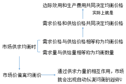 商品價值是由供求決定的,商品的需求量與供給量相等時的價格,即消費者為購買一定商品量所愿意支付的價格與生產者提供一定商品量所愿意接受的價格相一致的價格就是均衡價格。其中,邊際效用決定需求,生產費用決定供給。由邊際效用決定的需求和由生產費用決定的供給兩者的均衡,決定了價格,即為均衡價格。一旦市場均衡實現以后,如果市場價格偏離均衡價格,通過供求力量的相互作用,市場就會出現自動回復均衡的趨勢。在短期內,消費偏好決定價格,長期內,生產成本決定價格。因為邊際效用理論解決了短期內的定價問題,而生產理論解決了長期的定價問題。