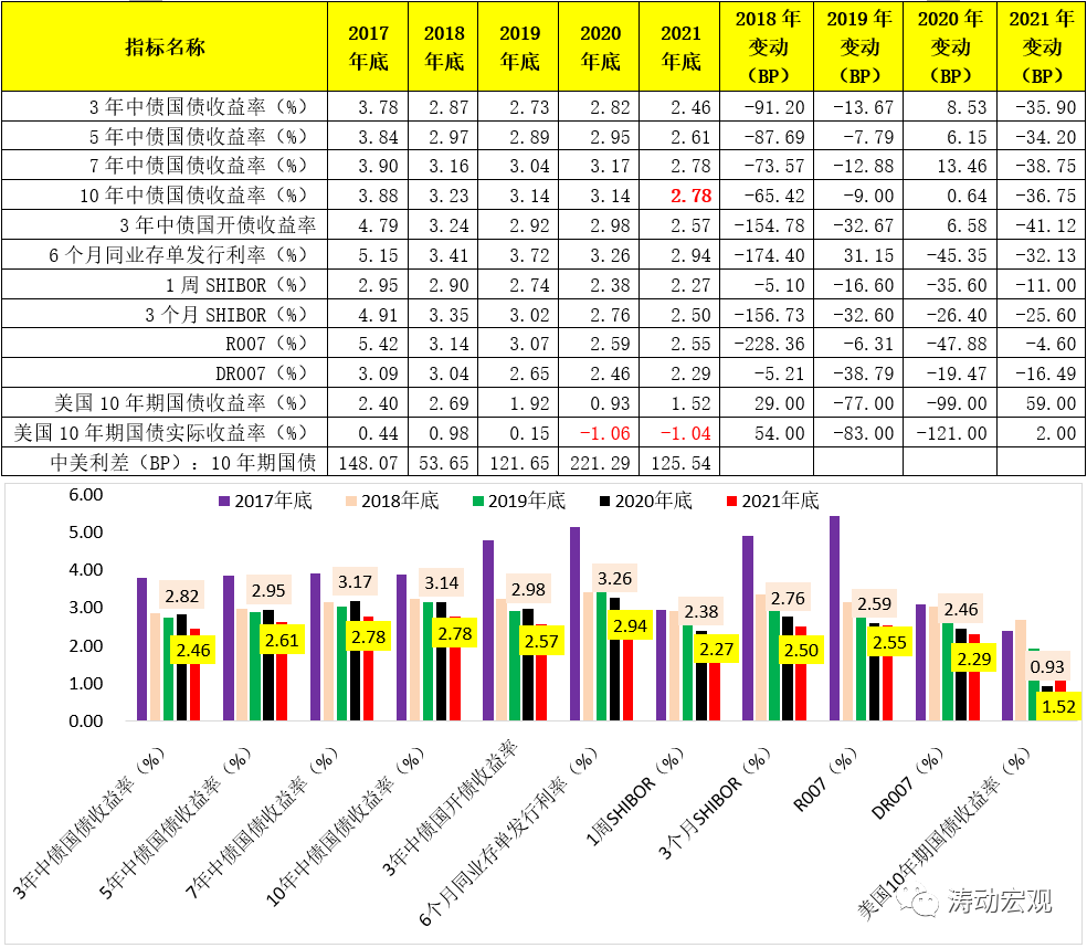 如果不考慮2020年的特殊年份,則中國債市自2018年起已連續(xù)牛了四年。以10年期中國國債收益率為例,2018年下行65.42BP、2019年下行9BP、2020年微幅上揚0.64BP、2021年下行36.75BP,也即2018年以來已累計110BP,而10年期國債收益率亦已降至2.80%以下,中美利差相應收窄至120-130BP之間。