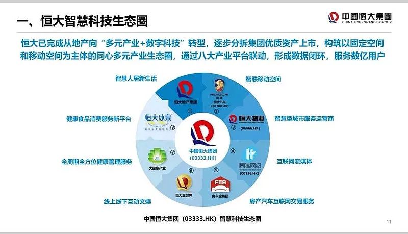 過去的恒大恒大是一家地產公司,而新恒大正在向“多元產業+數字科技”轉型,并逐步分拆集團優質資產上市,構筑以固定空間和移動空間為主體的同心多元產業生態圈。
