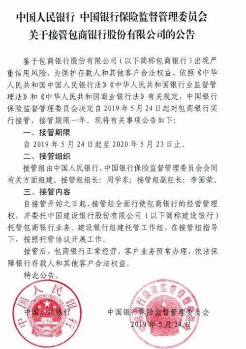 5月24日傍晚,中國人民銀行、中國銀行保險監督管理委員會聯合發布公告,鑒于包商銀行股份有限公司出現嚴重信用風險,中國銀行保險監督管理委員會決定自2019年5月24日起對包商銀行實行接管,接管期限一年。