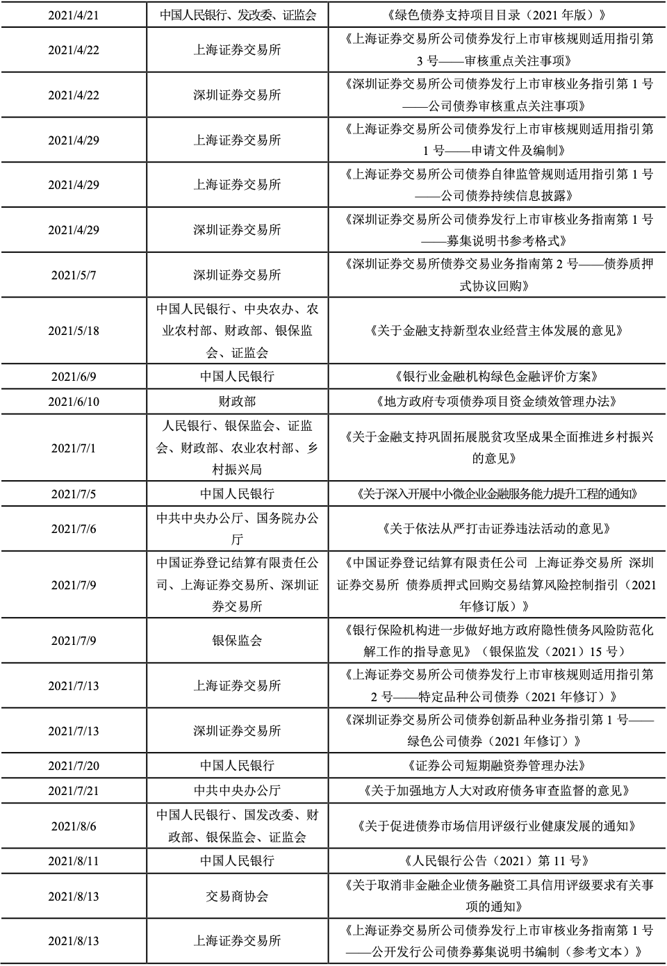 規范創新債券市場發展。一是完善綠色債券和鄉村振興債券發行規則。7月13日,滬深交易所分別發布《上海證券交易所公司債券發行上市審核規則適用指引第2號——特定品種公司債券(2021年修訂)》《深圳證券交易所公司債券創新品種業務指引第1號——綠色公司債券(2021年修訂)》等業務指引,進一步提高了綠色公司債券募集資金使用要求,確保募集資金用于綠色產業領域;新增“碳中和綠色公司債券”等綠色債券子品種的募集資金用途及信息披露要求指引;將原“扶貧公司債券”整體修訂為“鄉村振興公司債券”,明確了鄉村振興公司債券發行主體、募集資金用途及信息披露等相關安排。本次修訂有助于進一步完善公司債券創新品種規則體系,規范創新債券市場發展。二是規范綠色債券評估認證。9月24日,綠標委發布《綠色債券評估認證機構市場化評議操作細則(試行)》及配套文件,從綠標委對評估認證機構實施市場化評議和自律管理、市場化評議流程等方面規范評估認證機構行為,是國內首份針對綠色債券評估認證機構的自律規范文件,有助于提高評估認證質量,推動綠債市場健康發展。