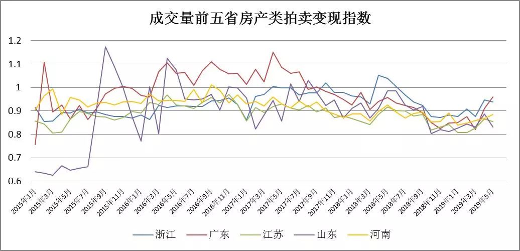 浙江省的房產類拍賣月度平均變現折扣率始終在100%附近小幅波動,并沒有表現出明顯的趨勢和周期性,變現能力始終較好。