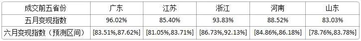 相較于五月份的規模指數,預測成交前五省的規模指數在六月份呈上升趨勢,其中,山東省增速較緩。
