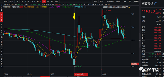 案例2:益豐轉(zhuǎn)債2020年6月22日上市,當(dāng)天開盤的轉(zhuǎn)股價值在117左右,作為藥房龍頭,在轉(zhuǎn)債市場具有稀缺性,上市當(dāng)天集合競價直接成交在130,觸發(fā)上交所臨停機制,到當(dāng)天14:57分恢復(fù)交易。一級投資者的出貨需求在最后3分鐘才得到釋放,價格被砸到125,對應(yīng)收盤時的轉(zhuǎn)股價值117,溢價率不足10%,是很好的買入時點。