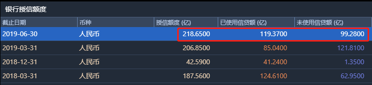 截至2019年6月30日,九華的授信額度總計218.65億元,使用過半。