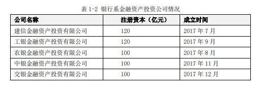 2016年10月國務(wù)院《關(guān)于市場化銀行債權(quán)轉(zhuǎn)股權(quán)的指導(dǎo)意見》,明確了銀行通過向?qū)嵤C構(gòu)轉(zhuǎn)讓債權(quán)、由實施機構(gòu)將債權(quán)轉(zhuǎn)為對象企業(yè)股權(quán)的方式實現(xiàn)市場化債轉(zhuǎn)股。2017年7月20日銀監(jiān)會批準建信金融資產(chǎn)投資有限公司開業(yè),隨后農(nóng)銀、工銀、中銀、交銀相繼獲批開業(yè),五大行的AIC成立(見表1-2),主業(yè)為市場化債轉(zhuǎn)股。
