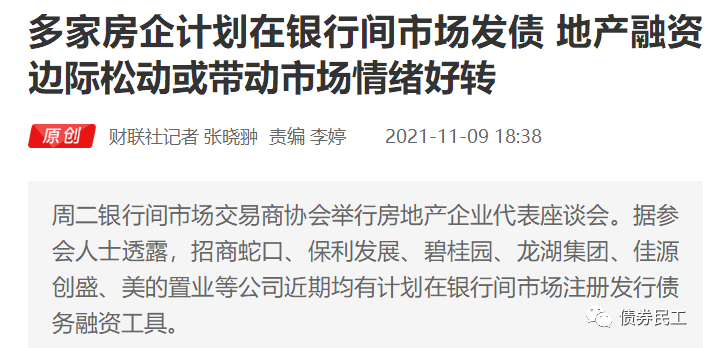 1、根據財聯社2021年11月10日的消息,交易商協會舉行了房地產企業代表座談會,部分房地產公司計劃發行債務融資工具產品。