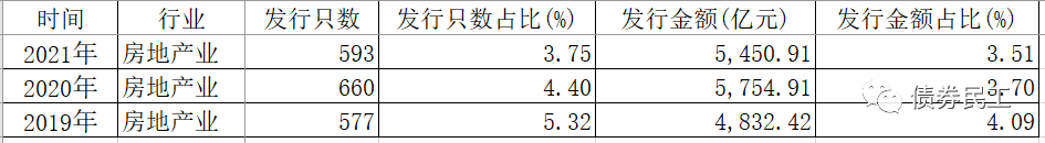 信用債券作為資本市場上重要的融資工具和手段,對于房地產行業來說十分重要。根據wind數據的房地產業口徑進行統計,從2019-2021年三年的1月-10月的信用債券融資數據來看,2021年房地產行業債券發行金額相比2020年同期略有下降,金額變化并不大。當然需要關注的是,房地產行業信用債券發行只數占比和發行金額占比均持續下降。