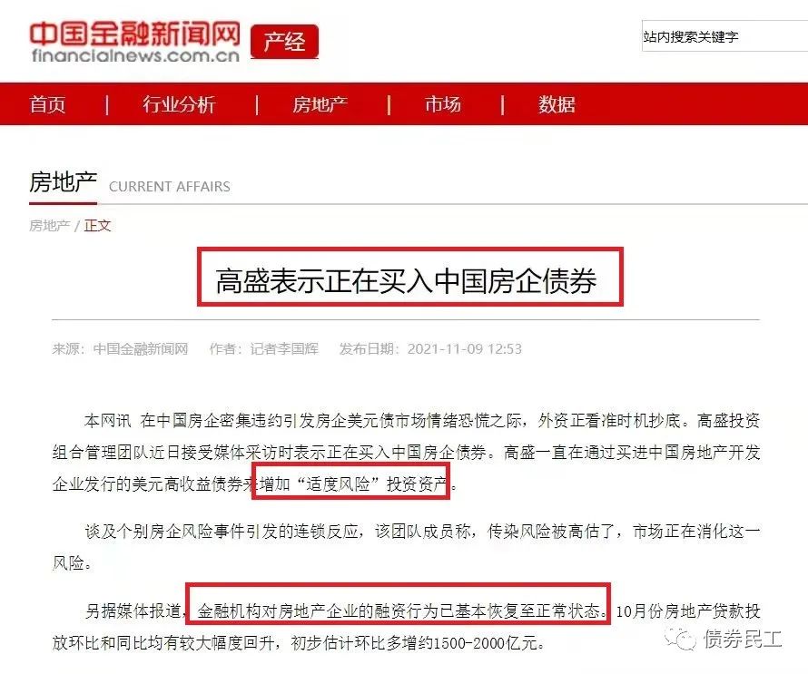 2、根據中國金融新聞網的報道,高盛表示正在買入中國房企債券,這對于近期波動較大的房企美元債市場無疑是一針強心劑。