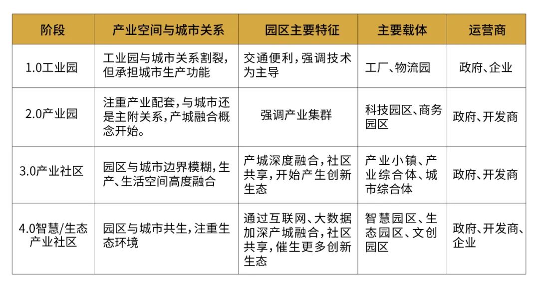 (2)與城市關系變化:產業園區在空間上逐步趨向城市功能,從最開始的交通導向到產業集群導向,再到產城融合導向,產業園區與城市關系也經歷了從割裂到共生的過程。