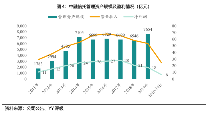 2019年末,中融信托存續(xù)信托項(xiàng)目997個(gè),受托信托資產(chǎn)規(guī)模為7,654.5億元,在信托行業(yè)中排名第五,截至19年末已清算產(chǎn)品平均收益率7.79%。實(shí)現(xiàn)營(yíng)業(yè)總收入51.7億元,居行業(yè)第二,實(shí)現(xiàn)凈利潤(rùn)17.55億元,居行業(yè)第十一。截至19年末,中融信托總資產(chǎn)為 276.2億元,資產(chǎn)負(fù)債率為 25.0%。