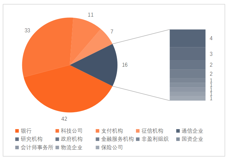 截至2021年6月,三批金融科技創新監管試點的參與機構共計109家,其中銀行有41家,占38%,科技公司有33家,占30%,其余有支付機構、征信機構、通信企業等。前四大參與機構類型合計有92家,占84%,可見試點應用的參與機構雖然種類眾多,但類型集中度很高,主要都是金融機構或者科技公司。