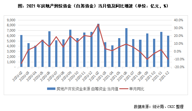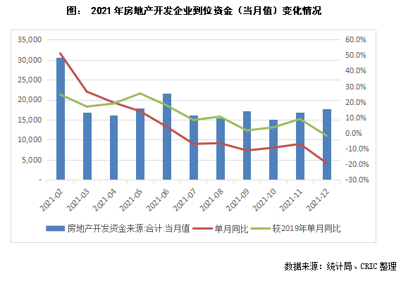 從自籌資金來看,12月房地產開發企業到位資金——自籌資金為6050億元,同比下降9.8%,較2019年同期增長7.1%,同比增速在11月由負轉正后再次回負。全年來看,2021年累計值達到65428億元,同比增長3.2%,增幅較前11月的4.8%進一步收窄,在當前整體融資環境收緊下,多個融資渠道均被封堵,雖部分企業通過多種方法自救充?,F金流,但大部分房企自有籌集資金能力有限,資金增幅有限。