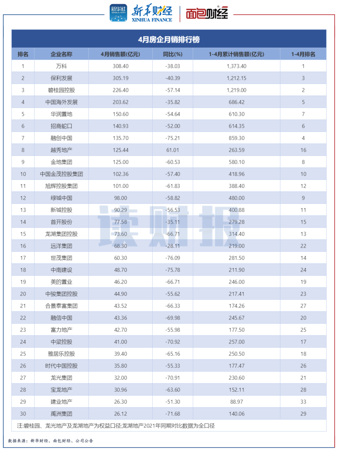 在3月短暫回暖后,4月地產(chǎn)市場情緒迅速轉(zhuǎn)冷。數(shù)據(jù)顯示,4月銷售額TOP30房企的銷售額平均同比降幅達54.42%。除銷售額同比增長61.01%至125.44億元的越秀地產(chǎn)以外,其余房企4月銷售額均為負增長。