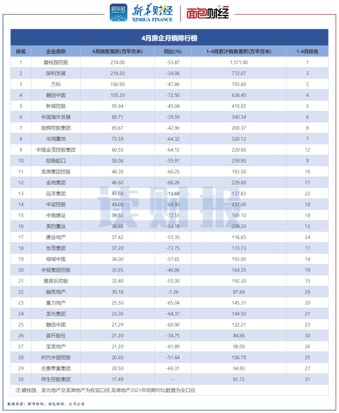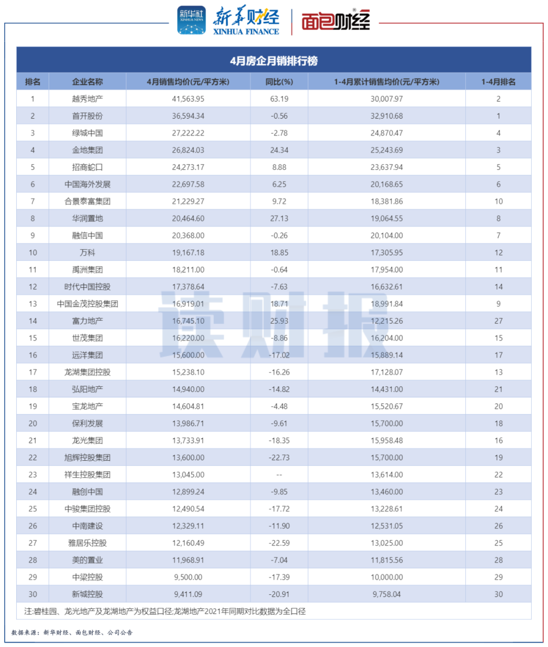 主流上市房企2022年4月銷售數(shù)據(jù)已經(jīng)披露完成。新華財經(jīng)和面包財經(jīng)研究員在剔除部分數(shù)據(jù)披露不全的上市房企后,以滬、深、港三大股票交易所39家主要上市房企為樣本,分別統(tǒng)計銷售金額、銷售面積以及銷售均價排名前三十的企業(yè)。