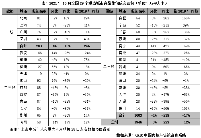 10月,典型城市商品住宅成交熱度延續低位波動,基本“見底”,29個監測城市預計成交規模達1946萬平方米,環比微降3%,同比降幅有收窄趨勢,下降22%,較2019年同期降幅為12%。