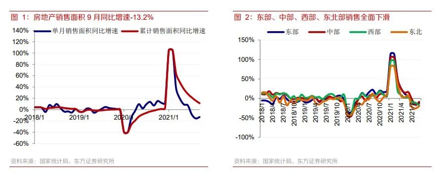 第一,單月銷售面積下滑。9月全國商品房銷售面積16139萬平米,同比下滑13.2%,相比2019年下滑6.9%。