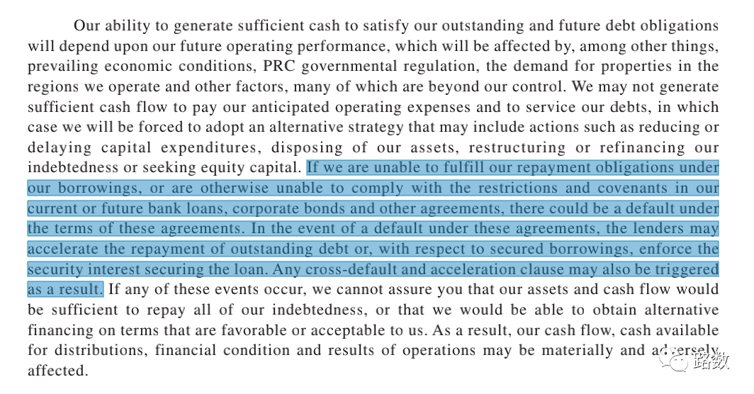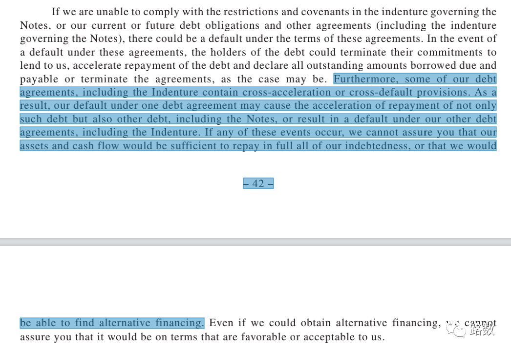 根據債券募集說明書,當中包含了加速清償和交叉違約條款。債務一旦發生違約,會觸發部分公募、銀行、信托借款的交叉違約,需要公司提前進行還款,屆時資金鏈壓力巨大。▼