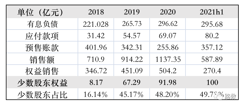 除了明面上的債務,新力地產還有兩大風險:一是較低銷售權益比所對應的較高少數股東權益;二是針對上下游企業的應付款項。▼