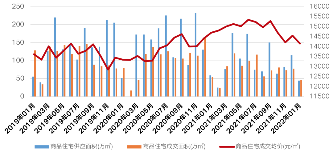 2022年前兩個(gè)月房地產(chǎn)市場(chǎng)并不樂觀,整體供應(yīng)、需求和價(jià)格都呈現(xiàn)下行趨勢(shì)。