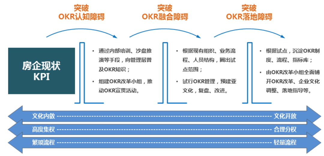 第二步,突破OKR融合障礙,采用漸進式、雙軌制融合的方式。在OKR獲得認知、知識普及之后,“OKR小組”、運營、HR等部門可以結合房企自身管控風格、管理細節等特性,著手研討和試點OKR與現有治理機制的融合。