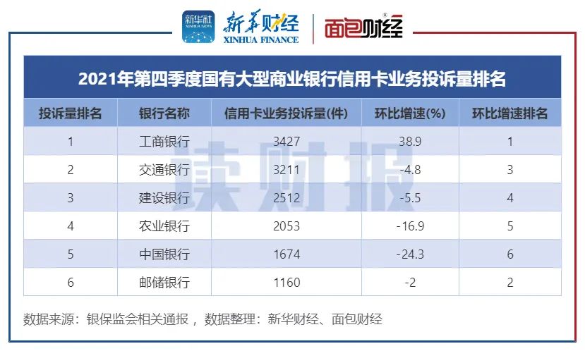 圖4:2021年第四季度國(guó)有大型銀行信用卡業(yè)務(wù)投訴量排名