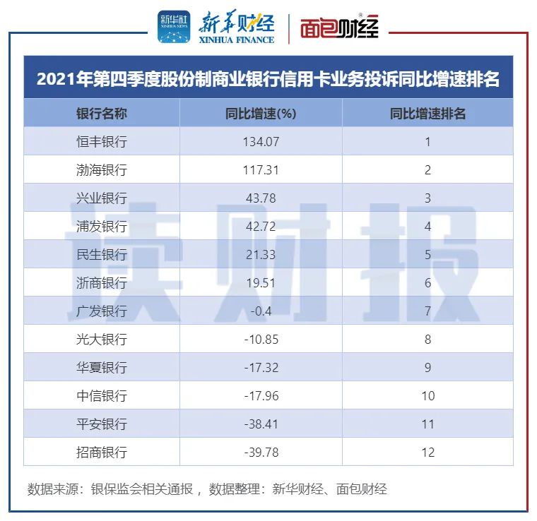 從2021年第四季度的同比增速來(lái)看,恒豐銀行和渤海銀行位居股份制銀行前兩位。但是,這主要是由于兩家銀行去年基數(shù)較低造成。即便在翻倍增長(zhǎng)之后,2021年四季度兩家銀行的信用卡業(yè)務(wù)投訴量合計(jì)仍不超過(guò)500件。
