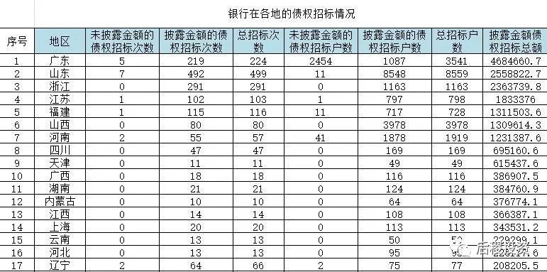 銀行招標次數(shù)前五的省份是山東、浙江、廣東、福建和江蘇,戶數(shù)前五的省份是山東、山西、廣東、河南和浙江,而披露的金額前五的省份是廣東、山東、浙江、江蘇和福建,山西和河南排第六和第七。總體來說除傳統(tǒng)成交活躍大省外,河南和山西等中部地區(qū)省份的銀行的債權(quán)招標力度也較大。