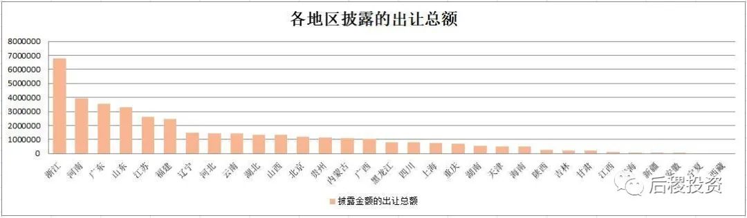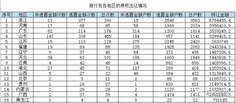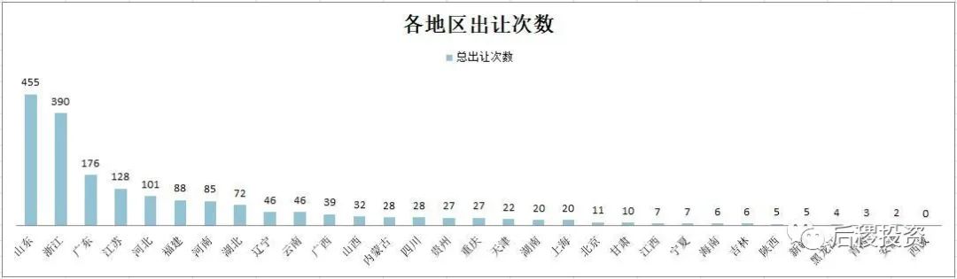 從上圖看,銀行出讓成交次數(shù)前五的省份是山東、浙江、廣東、江蘇和河北;戶數(shù)前五的省份是浙江、江蘇、福建、河南和河北,廣東排第六;而出讓總額排名前五的省份是浙江、河南、廣東、山東和江蘇,福建、遼寧、河北、山西緊隨其后,較其他地區(qū)為高。仍舊可以看出東部地區(qū)省份,銀行的出讓力度較其他地區(qū)為高,當然這也與我國的經(jīng)濟總量分布有關(guān)。