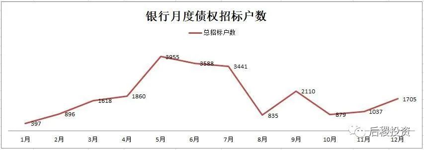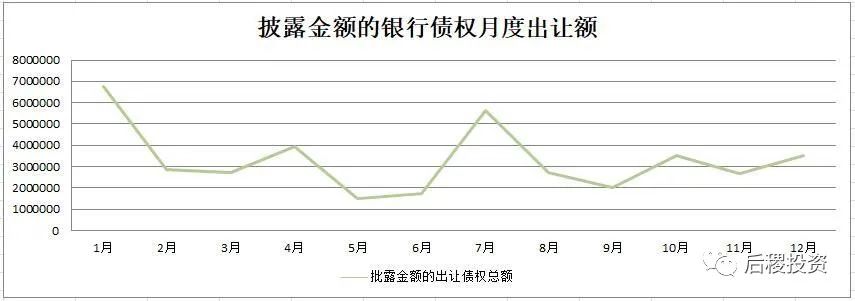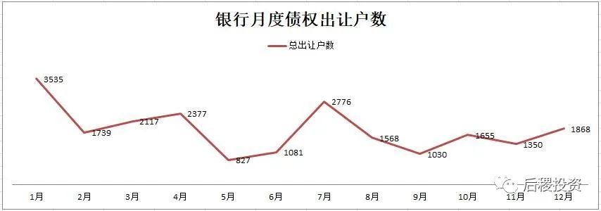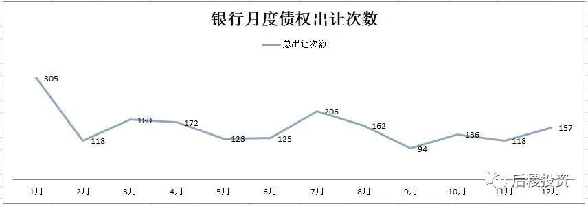 除1月外,銀行月度出讓次數(shù)曲線的區(qū)間為94-206次,區(qū)間中值為150次左右,戶數(shù)區(qū)間為827-2776戶,區(qū)間中值為1800戶左右,而月度出讓成交金額的區(qū)間中值則為350億元左右。1月和7月是公告成交的高峰期,這與業(yè)務(wù)規(guī)律也契合。
