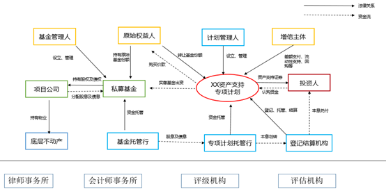 通過系列資產重組安排,實現私募基金持有項目公司的股權和債權,項目公司持有物業資產的結構。資產管理人向投資者募集資金設立專項資產支持計劃,并發行資產支持證券。管理人以認購資金向原始權益人購買原始權益人持有的基金份額及其相關附屬擔保權益(如有),實現基礎資產由原始權益人向專項計劃的轉讓。