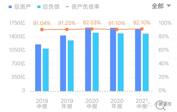 截至2021年6月末,建業地產總資產為1613億元,總負債1486億元,凈資產127.5億元,資產負債率高達92.1%。