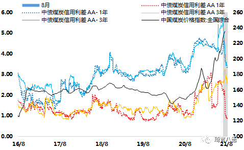 高等級的山能、晉焦受息差限制下行幅度較小;山西五大煤加速下行150~200BP;冀中及平煤股份利差也明顯改善。特別是中低等級3年信用利差首次下行,說明部分機構(大概率還是銀行為主)開始認可煤債中長期限的配置價值。