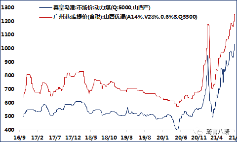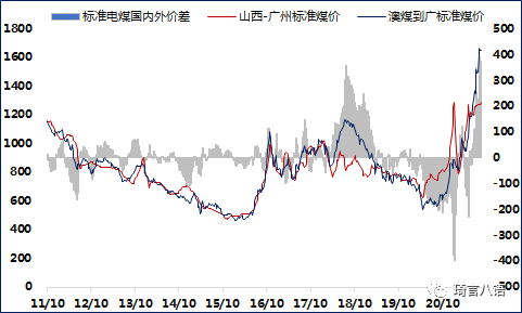 第四,海內外電煤價差倒掛且處于歷史高位,今年進口額度不僅沒有如往年成為限制煤價上漲的手段,高進口煤價反而對國內煤價形成強支撐: