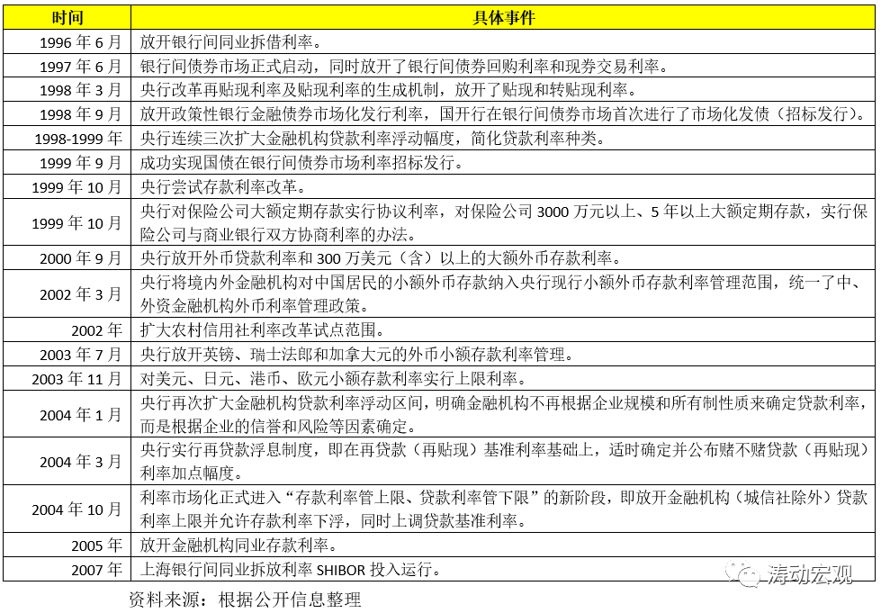 我國(guó)利率市場(chǎng)化最早源于1993年的兩份文件,在1993-2007年的15年時(shí)間里,我國(guó)先后放開(kāi)了貨幣市場(chǎng)利率和債券市場(chǎng)利率,利率市場(chǎng)化真正進(jìn)入“存款利率管上限、貸款利率管下限”的新階段。
