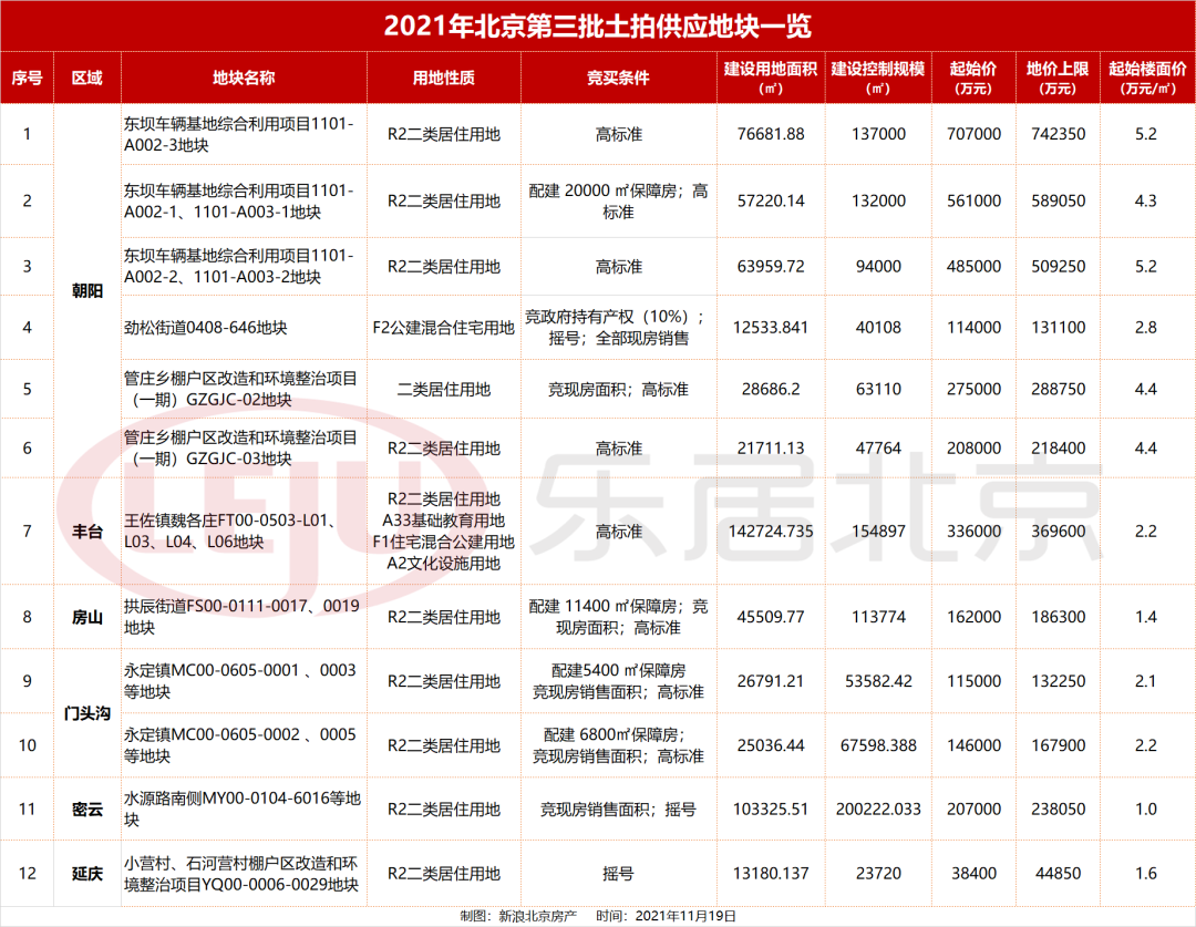 又是一頓周五深夜放毒。11月19日,周五晚,北京規自委公布2021年第三批次供地,合計13宗地,其中住宅用地12宗,總供地面積約62萬㎡,建筑規模約113萬㎡,總起拍價約331億元。