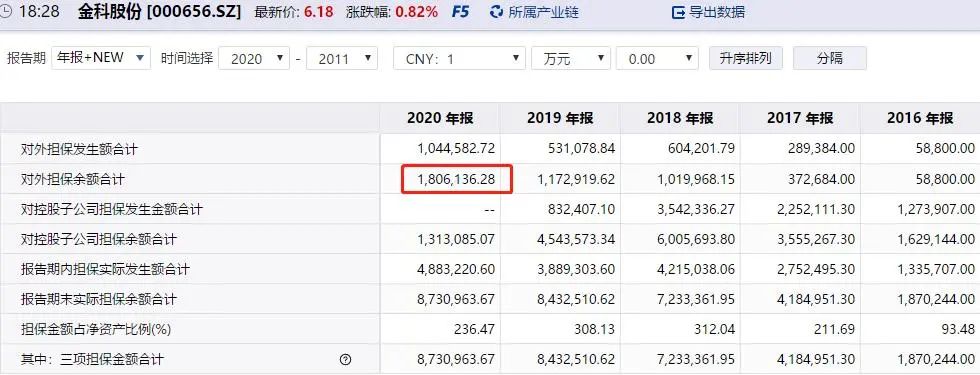 雷達財經(jīng)發(fā)現(xiàn),金科股份的財務附注中,2020年對外擔保余額合計180.61億元,較2019年同比增長54%。