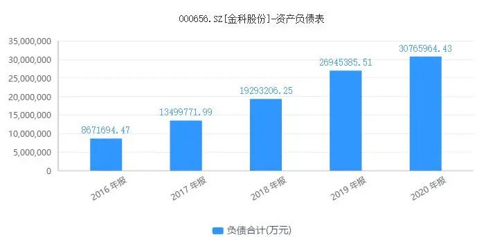與許多靠負債實現(xiàn)規(guī)模發(fā)展的房企類似,金科股份銷售額從破千億,再到超2千億,這一路狂奔為也是通過杠桿經(jīng)營發(fā)展起來的。2016年,金科股份負債合計867.2億元;到了2020年末,公司負債飆升至3076.59億元。